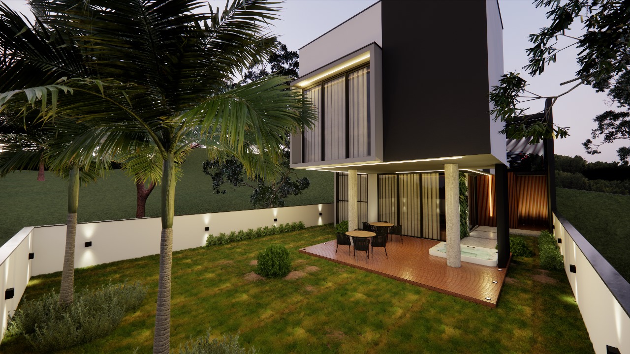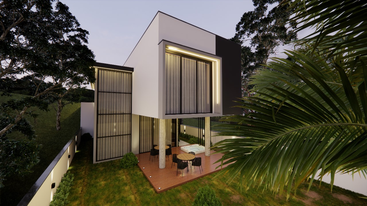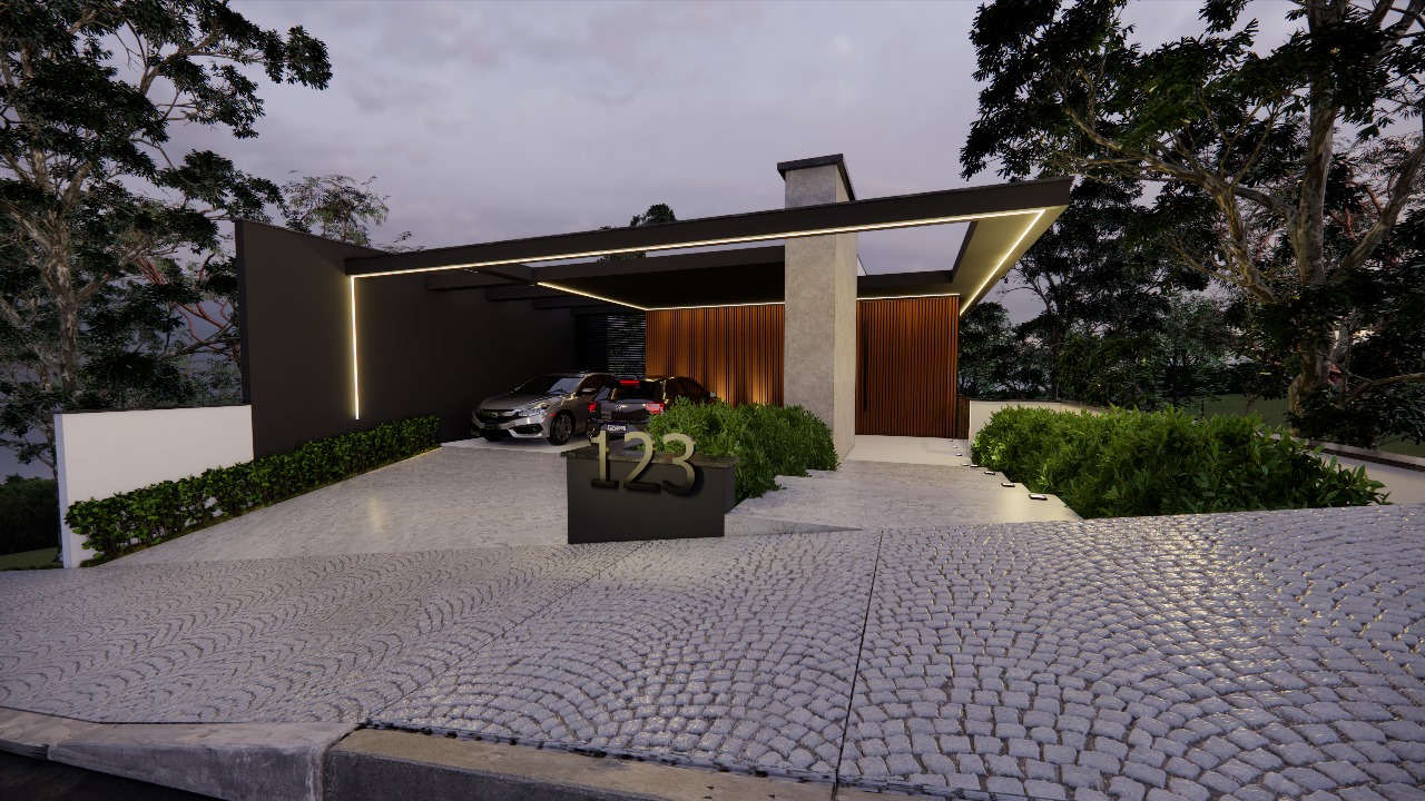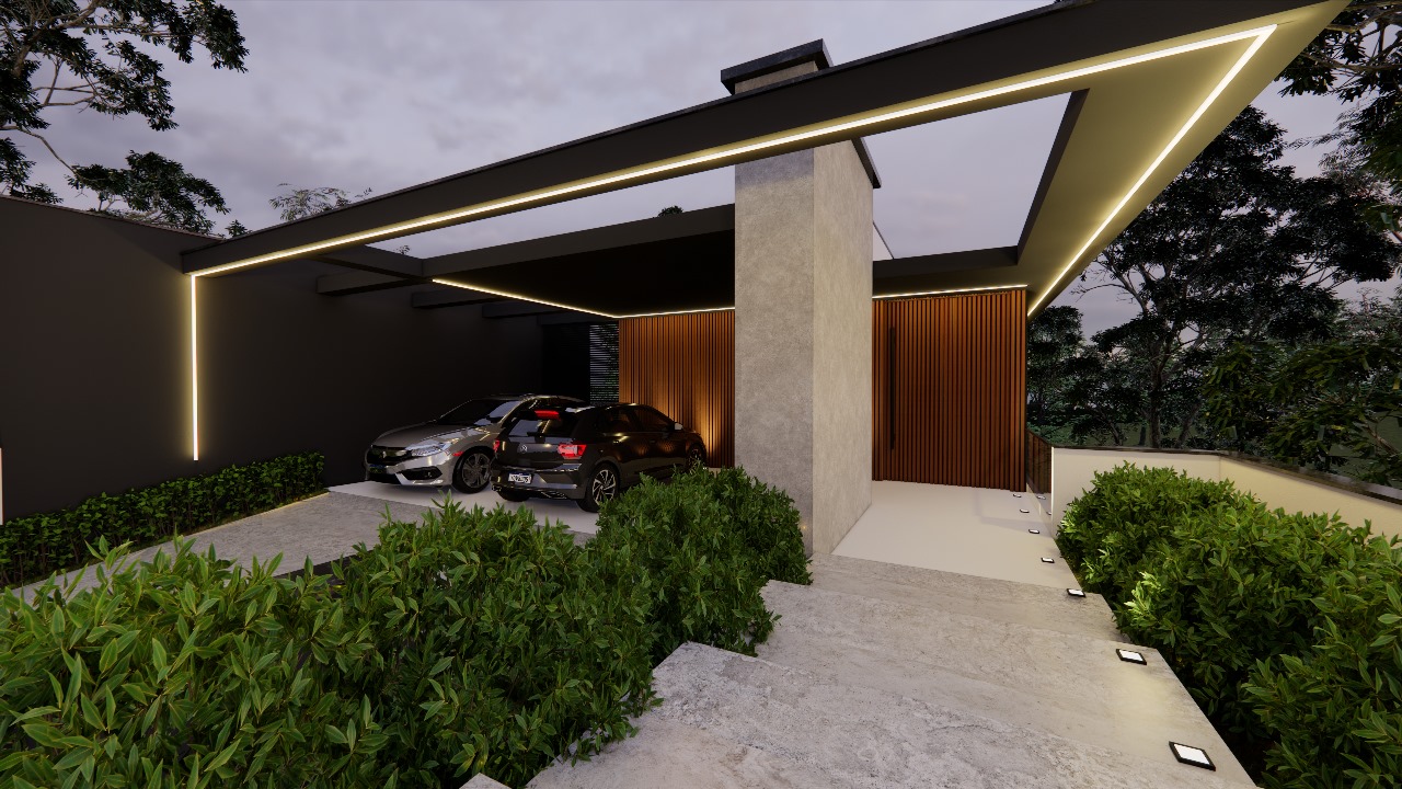 Com suaves toques rústicos, a fachada do projeto conta com telhado aparente e muro com marquise e vidro translúcido. Em seu único pavimento, o projeto distribui sala de estar, sala de jantar, cozinha, despensa, lavanderia, dois quartos, uma suíte e um banheiro social em menos de 100m². O projeto ainda conta com uma garagem com capacidade para dois carros e uma pequena área gourmet. O projeto se destaca por atender as necessidades de famílias médias em poucos m², encaixando os ambientes de forma funcional e ainda garantindo áreas de lazer, ambientes integrados e a aclamada cozinha americana.