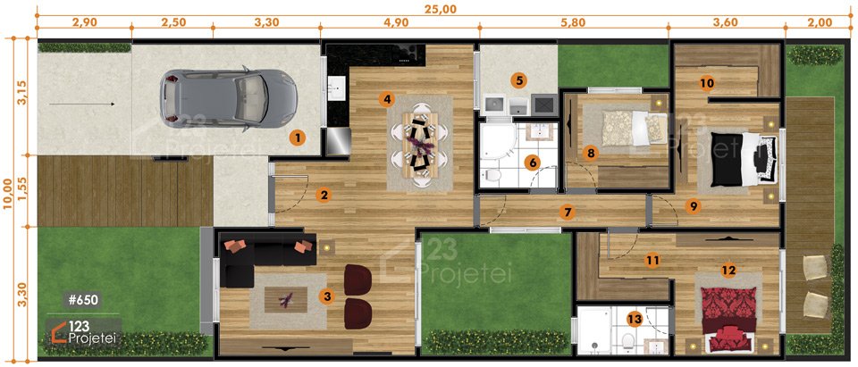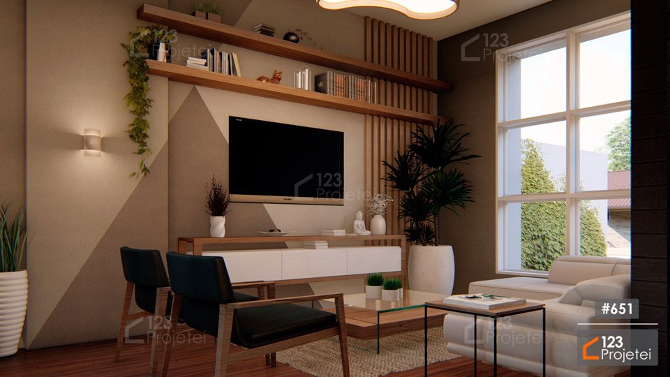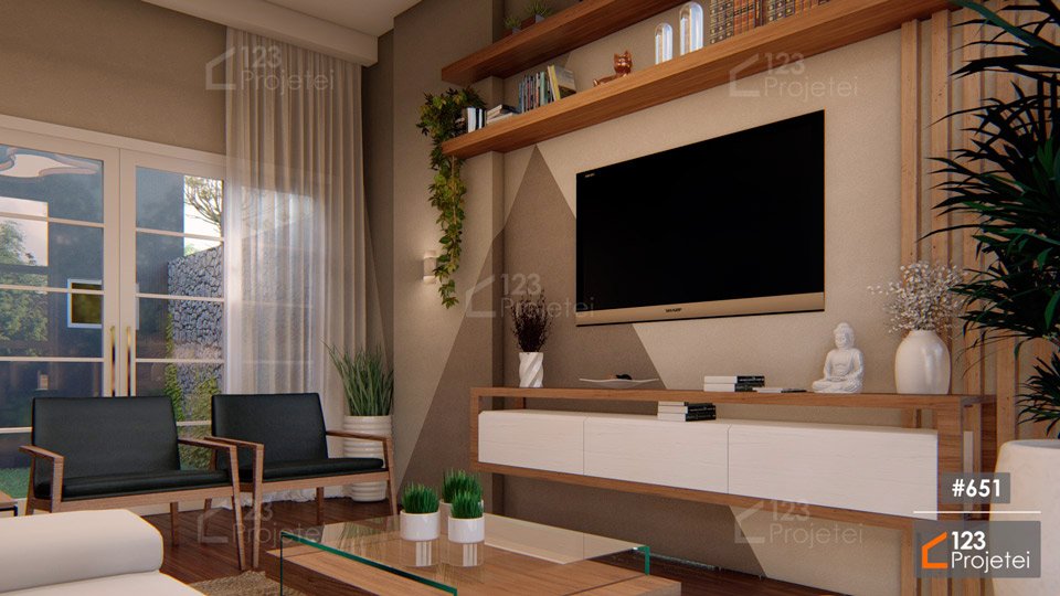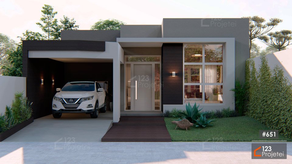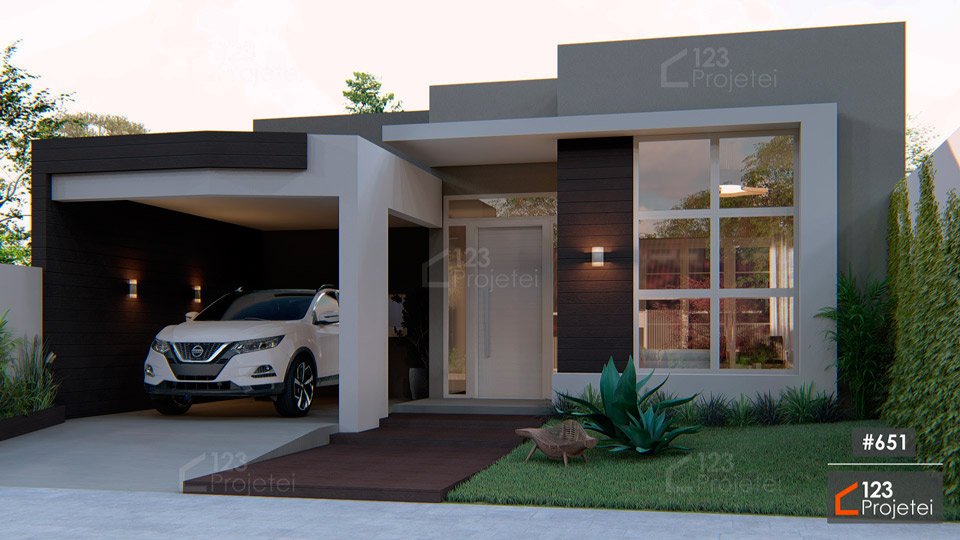 Com suaves toques rústicos, a fachada do projeto conta com telhado aparente e muro com marquise e vidro translúcido. Em seu único pavimento, o projeto distribui sala de estar, sala de jantar, cozinha, despensa, lavanderia, dois quartos, uma suíte e um banheiro social em menos de 100m². O projeto ainda conta com uma garagem com capacidade para dois carros e uma pequena área gourmet. O projeto se destaca por atender as necessidades de famílias médias em poucos m², encaixando os ambientes de forma funcional e ainda garantindo áreas de lazer, ambientes integrados e a aclamada cozinha americana.
